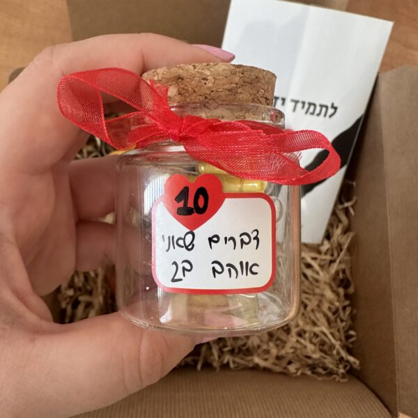 ♥ צנצנת קטנה עם 10 קפסולות בהן כתובים 10 דברים שאת/ה אוהב/ת בבן/ת הזוג שלכם (כתבו אותם למטה)